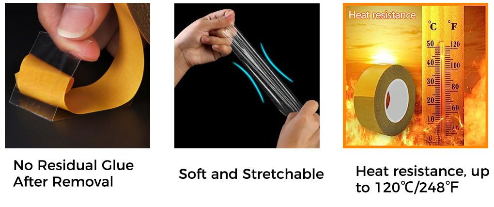 - Multi-purpose double-sided tape: compatible with different fabrics, and hard but smooth surfaces.