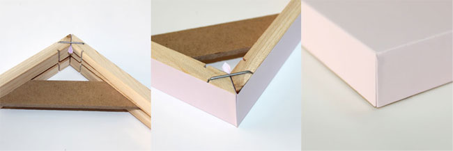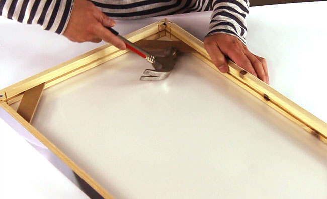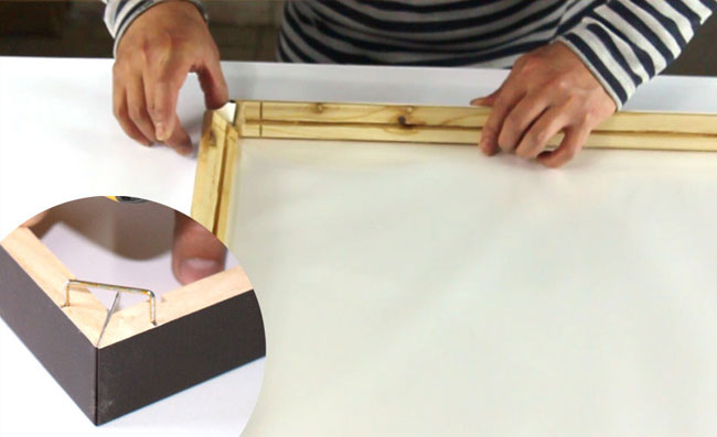 Step4. Turn the wooden frame laths erected; fold the angle section of picture into the middle of two laths, fixed the laths with U-shaped nails; the other three corner in the same way.