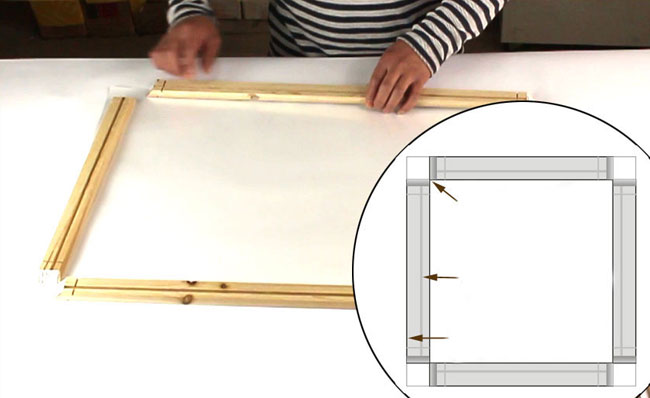 Step1. Turn over the picture, put the four wooden frame laths on the picture. As shown in figure (corner to corner, narrow side inward, wide-side outward and coincide with edge of the picture,) make sure the size of picture is correct.