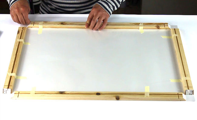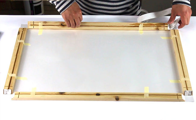 Step2. Fixed the wooden frame laths with yellow tape, keep the relative position of the picture and wooden frame laths.