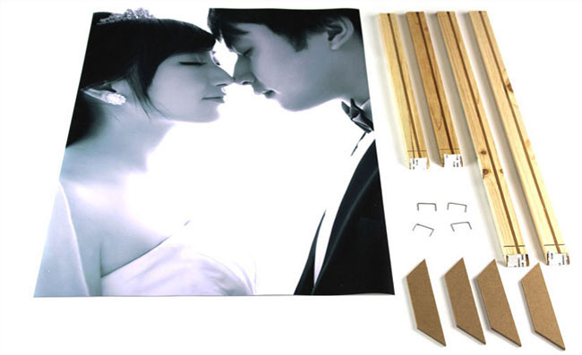 Pictures (photographic paper, canvas, high-precision wove photographic paper, cross stitch, etc.), Frame Kit (contains wooden frame lath x4, trapezoid inserts x4, U-shaped nail x4), and a utility knife.