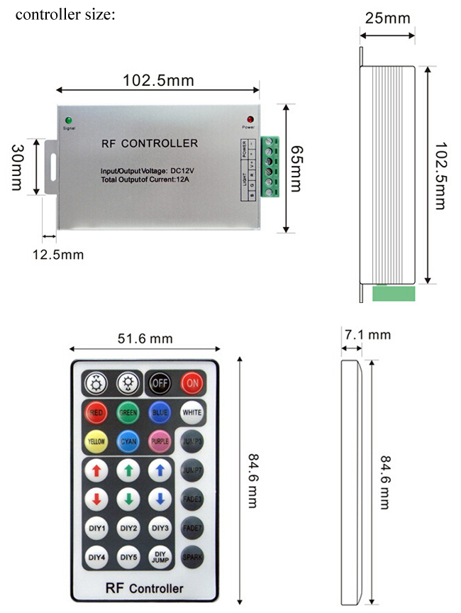 Un control remoto infrarrojo, usando la velocidad de la viruta del control del microordenador, se utiliza para controlar todo tipo de led como fuente de luz de lámparas y linternas, tales como: barra de luz suave luz, duro de led, módulos led, etc.. Es uno de lo indispensable para modernas aplicaciones led. Los clientes pueden elegir sus favoritos según el modo de cambio de botones de control remoto, el usuario también puede personalizar cualquier tipo de color y puede almacenar hasta seis modo.