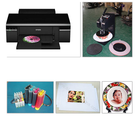 Para lograr a transferencia en la taza, necesita una impresora piezoeléctrica (como la Epson R330), cartucho de tinta (tinta), sublimadora, pape de sublimación A3 o A4 (papel enrollado también está disponible para diferentes impresoras) y platos en blanco