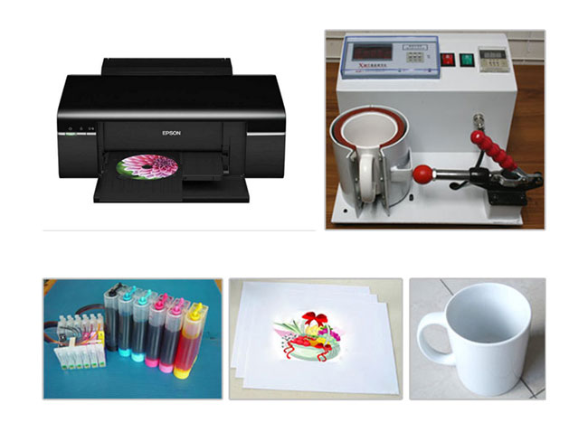Para lograr a transferencia en la taza, necesita una impresora piezoeléctrica (como la Epson R330), cartucho de tinta (tinta), sublimadora, pape de sublimación A3 o A4 (papel enrollado también está disponible para diferentes impresoras) y tazas en blanco.