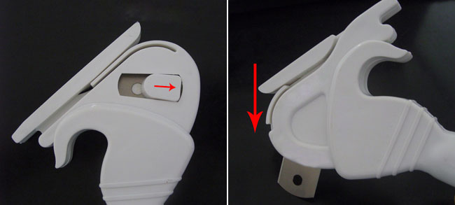 | Afloje el seguro lateral y empujelo al lado derecho. | Inserte la cabeza del cutter y saque la navaja. |