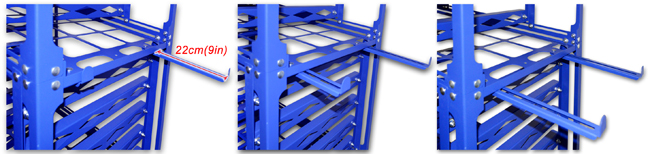2. Ambos lados del bastidor están configurados con tres vigas de capa estirables, la longitud máxima estirable es de 22 cm (9) y el usuario puede colgar el marco de pantalla vacío en la viga. También puede colocar marcos de pantalla verticales, cuando no es necesario utilizar, las vigas se pueden empujar en el rack.