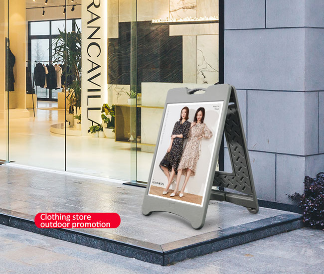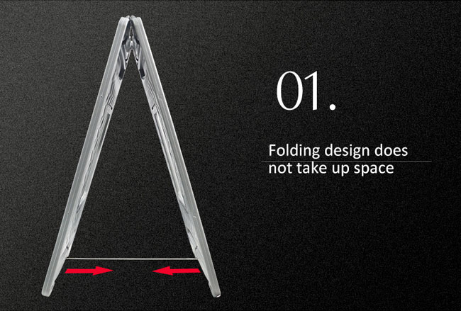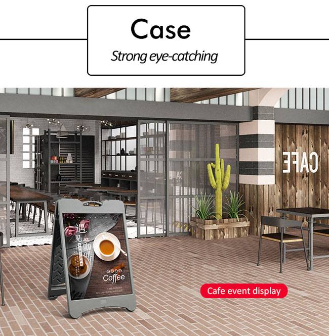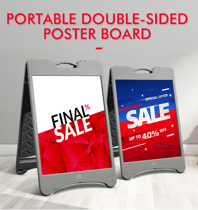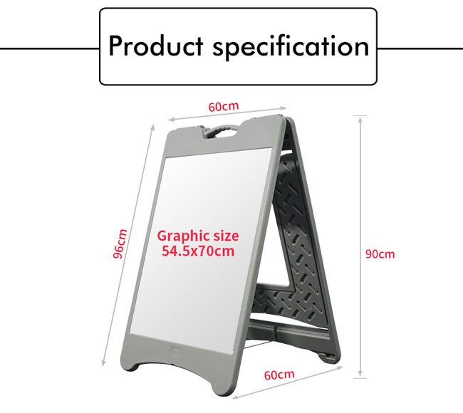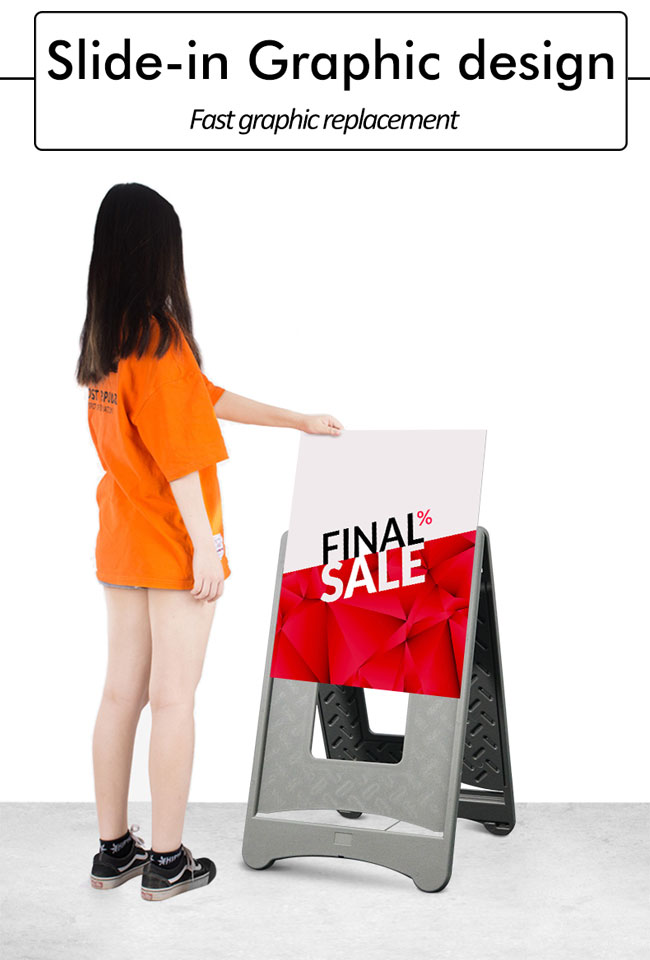 Whole plastic pavement sign board outside, similar as aluminum A-frame design, could fill with water to ensure stable on the floor. It is the most popular product in the market.
