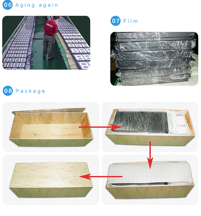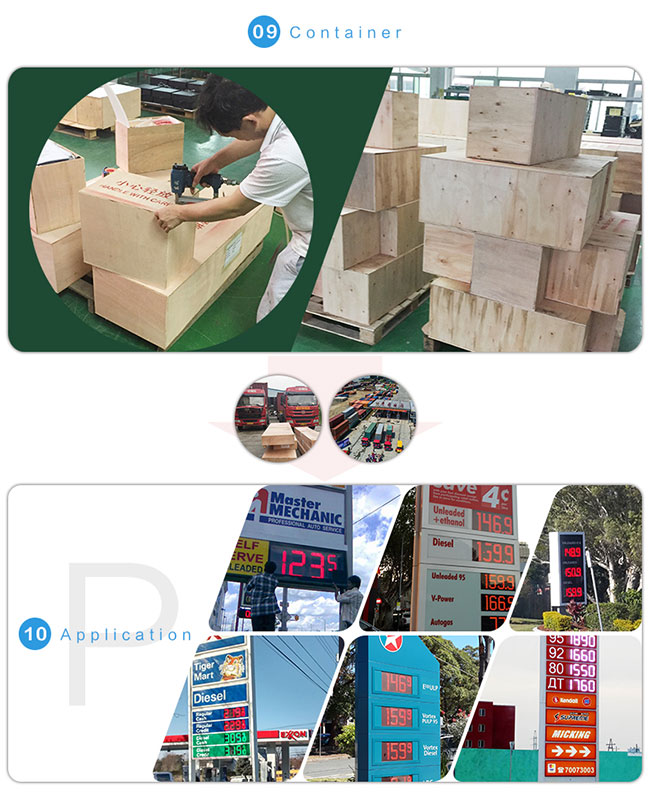 The LED oil price screen is placed in a rectangular box with a height of 1-3 meters. One side display area is 1.2-4.5 square meters. Flexible installation, wide range of application. The angle is adjusted flexibly. The effective sight distance is small. It is suitable for the gas station in the city and the small gas station.
