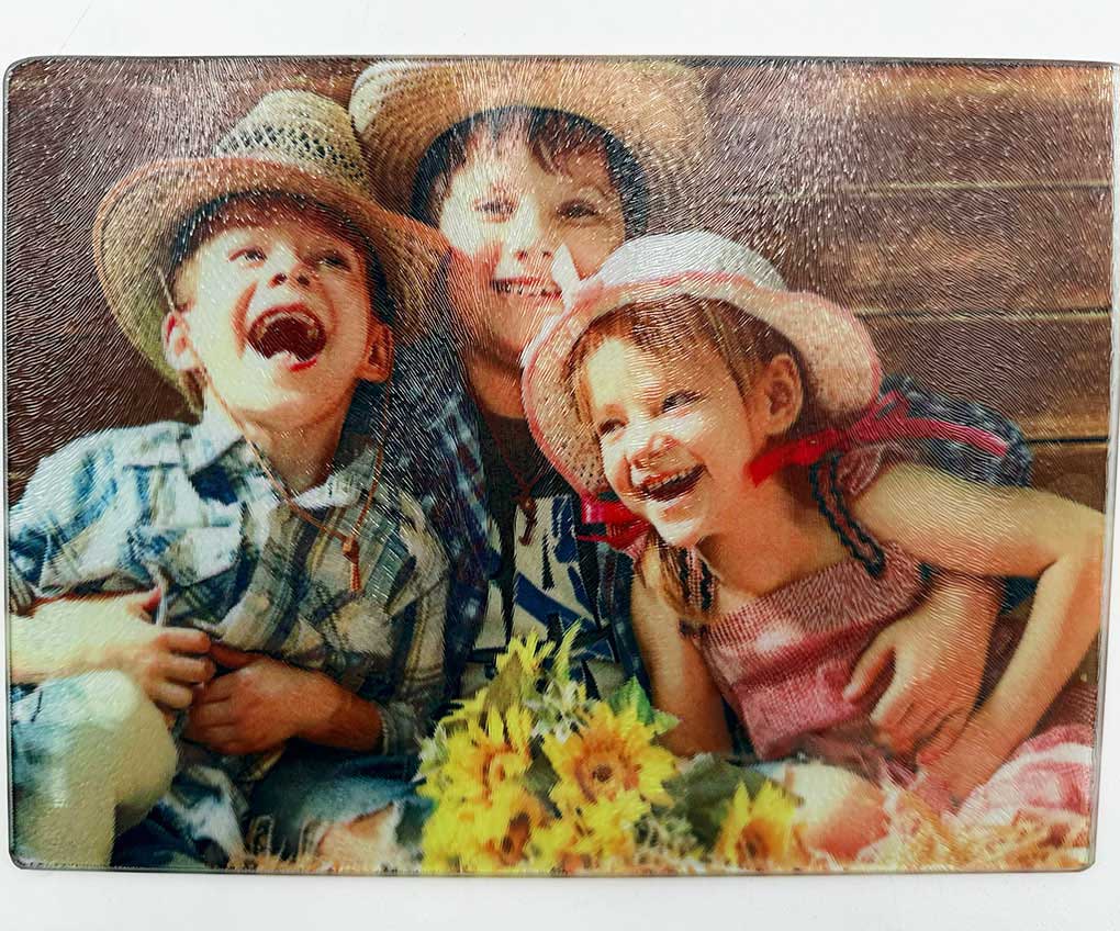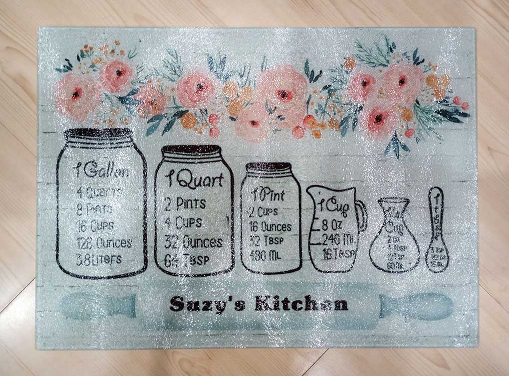 The tempered glass boards can be personalized with full-color images, designs, and logos, while producing vibrant image reproductions. This glass cutting board will spice up kitchen cutting.