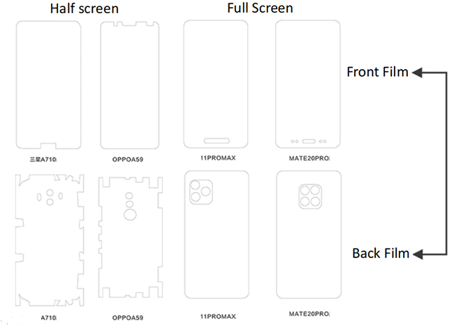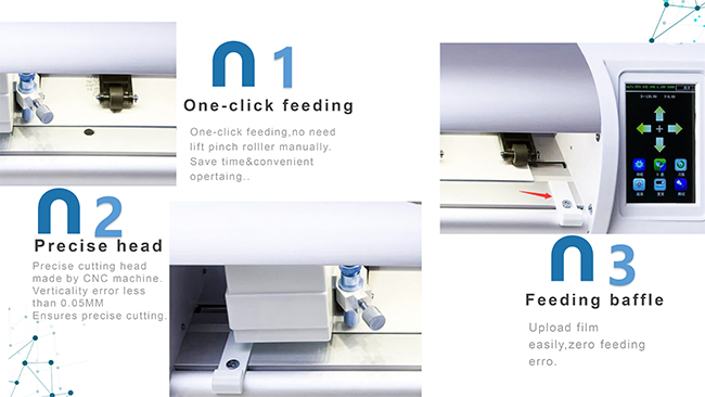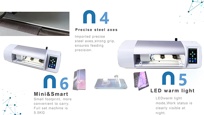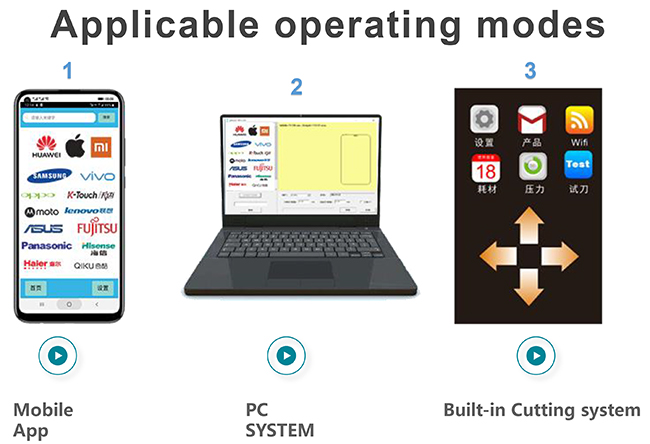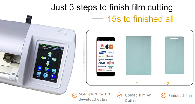 The mobile phone film cutter is a cutter developed for cutting flexible PE film, PU film, hydrofilm and other mobile phone explosion-proof film. The cutter operating system is very simple, comes with mobile APP database.Just take 1 minute to learn how to use it.