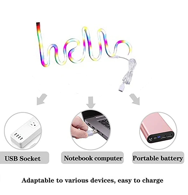 2.DIY LED Neon Signs come with USB cord. With double-sided tape, mounting-clips & screw(5 each), easy to fix the LED neon sign to the wall. You can either use the battery pack or plug it to USB port,set,power bank etc.