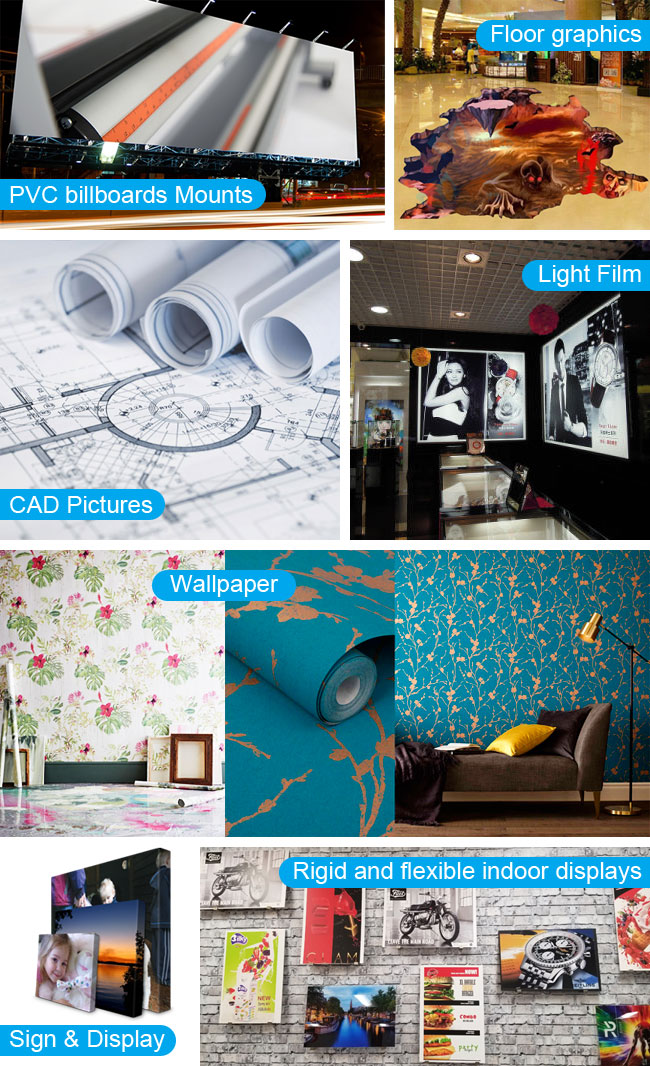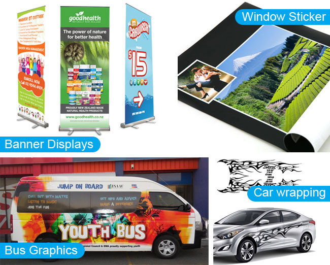 Sign & display, window graphics, banner, poster, POP, vehicle wrapping, wallpaper, cutting sheet sticker, labels & decals, proof, POS display, package, sign board, flyer, document finishing, floor graphics, rigid and flexible indoor displays, board and many more.
