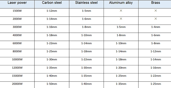| Material | 1000W | 1500W | 2000W | 3000W | 6000W |