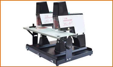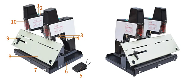 1.Power switch 2.Strength adjustment gear 3.Binding depth adjustment knob 4.Manual control switch 5.Foot switch 6.Alloy die casting base 7.Bench locking knob 8.Quickly switch table 9.Paper locator 10.Safety door