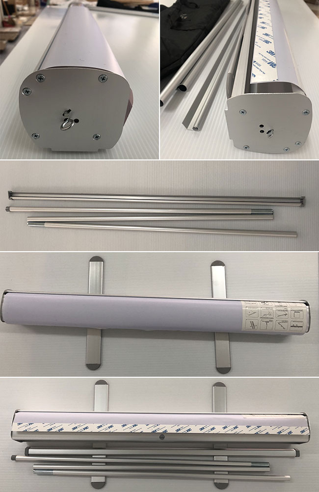 This roll up display stand, also known as a retractable banner system, is ready to set up almost immediately. Just flip out the feet, raise the pole, and lift the banner. This roll up display stand automatically rolls the banner into `the` base for storage and transportation.