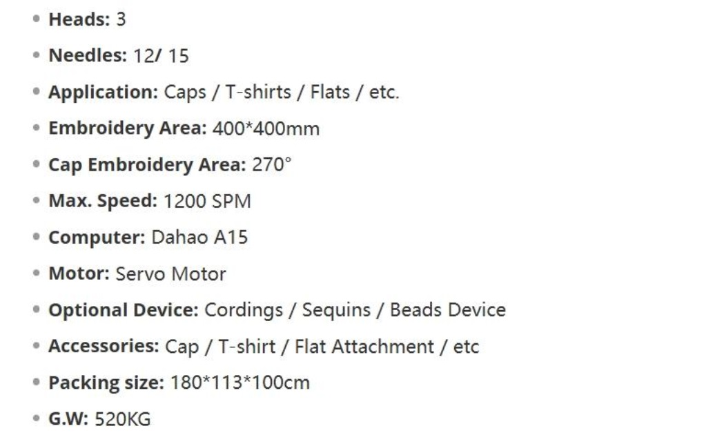 400X400mm 3 Heads 12/15 Needle Embroidery Machine