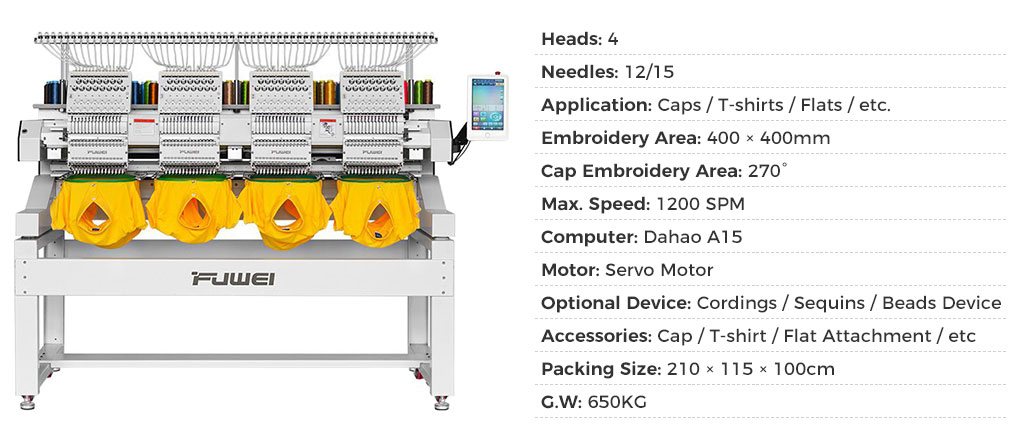 Four head Embroidery Machine with 12/15 Needles, 1200SPM Max Speed, Touch Screen,Your First Commercial Embroidery Machine for Cap, Flat, T-shirt and more