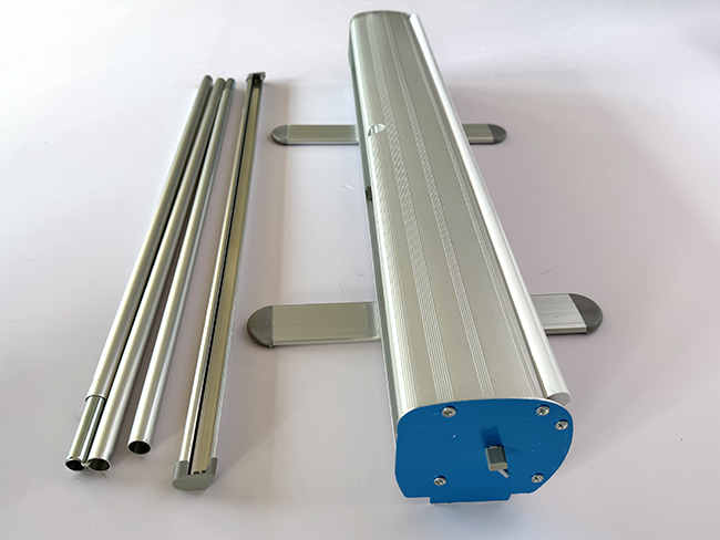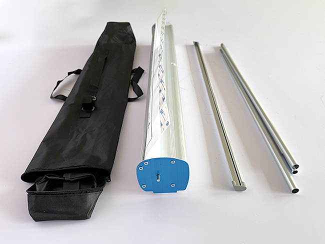 This roll up display stand, also known as a retractable banner system, is ready to set up almost immediately. Just flip out the feet, raise the pole, and lift the banner. This roll up display stand automatically rolls the banner into `the` base for storage and transportation.